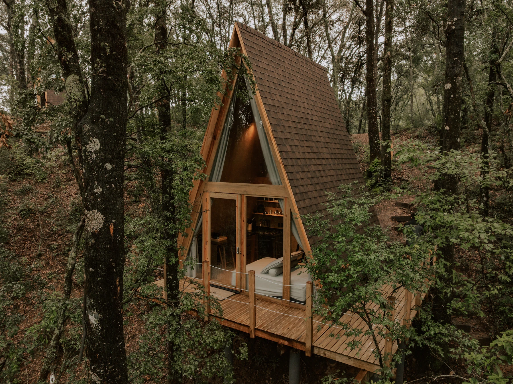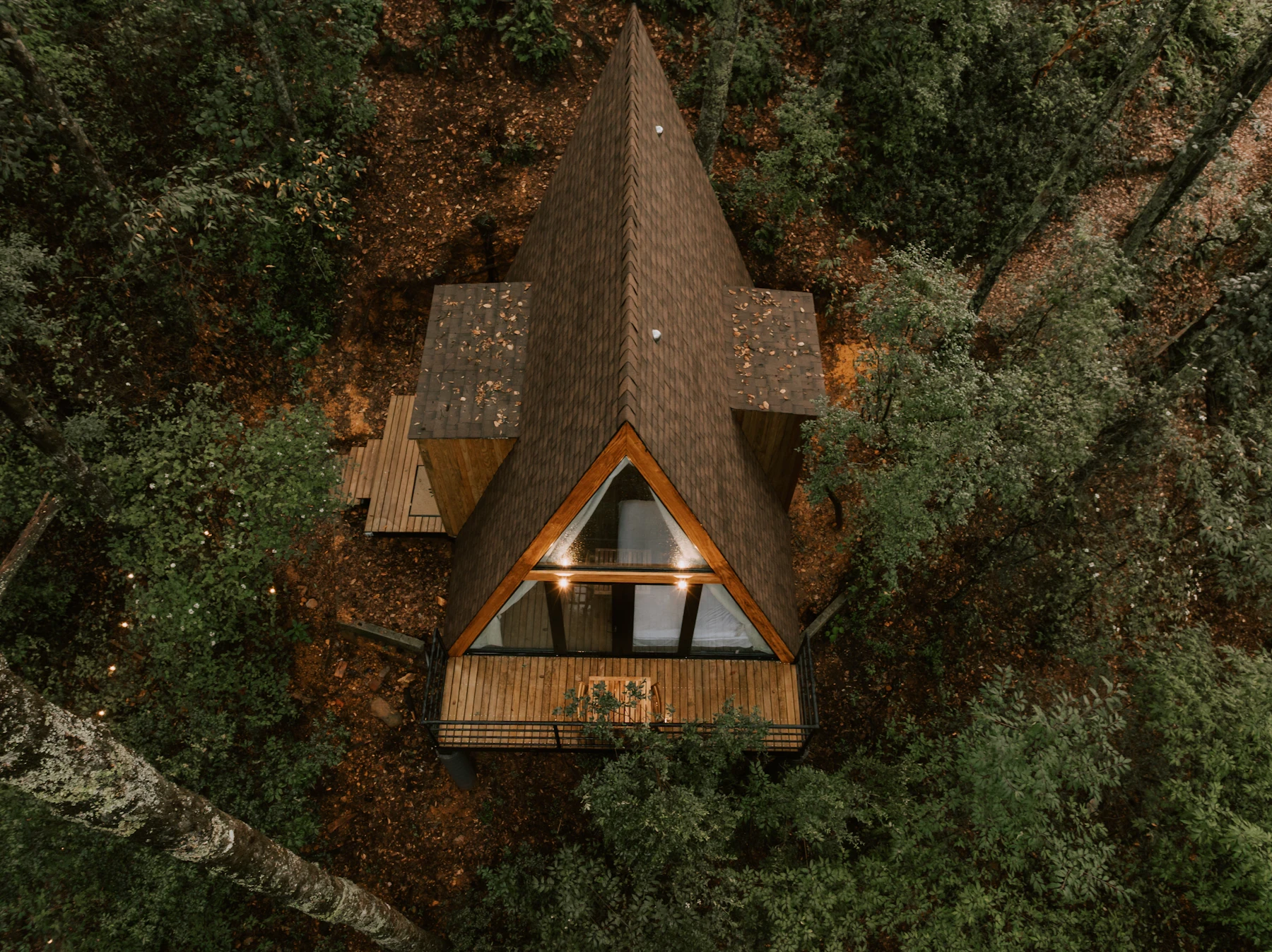 Nuestra cabaña estrella en versión grande, la A Frame Super! Esta cabaña es la UNICA de su tipo en todo Wander, 25% mas grande que cualquier otra cabaña y que las demás A Frames. La cabaña cuenta con DOS camas, una Queen y una KING, siendo la única cabaña en Wander con una cama de ese tipo, ambas con sábanas y almohadas frescas. Cuenta con una cocina agrandada y una mesa redonda de buen tamaño en el interior con vista al bosque. La cabaña cuenta también con una entrada privada lateral y vistas panorámicas a través de un enorme cristal redondo permiten a los huéspedes disfrutar de la belleza del bosque.